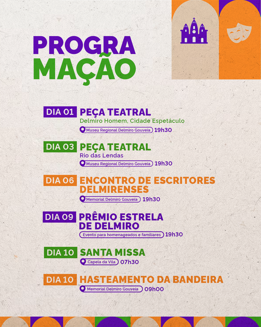 As atividades têm início no dia 1º de outubro, com a peça teatral Delmiro Homem, Cidade Espetáculo, no Museu Regional, às 19h30. No dia 3, o público poderá prestigiar outra apresentação teatral, Rio das Lendas, também no museu. O dia 6 será dedicado à literatura, com o Encontro de Escritores Delmirenses, realizado no Memorial Delmiro Gouveia, às 19h30.