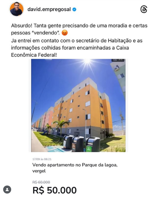 Em uma das postagens compartilhadas, David mostrou um print de um anúncio em que um apartamento do conjunto é oferecido por R$ 50 mil. “É um absurdo! Enquanto tantas famílias precisam de um lar, alguns estão tentando lucrar com isso”, afirmou o parlamentar.