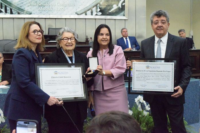 A Assembleia Legislativa realizou na manhã desta segunda-feira, 6, uma sessão solene para outorga da Medalha de Mérito Lily Lages e do título de Cidadã Honorária de Alagoas à senhora Nancy Virgínia Karns Lyra, pelos relevantes serviços prestados ao Estado. Proposta pela deputada Fátima Canuto (MDB), a solenidade contou com a participação de familiares, amigos, autoridades políticas e empresários do agronegócio alagoano. Ao justificar a propositura da solenidade, a parlamentar disse que a homenageada é uma visionária que tem uma história de vida marcante e um profundo apreço e compromisso com o Estado de Alagoas.