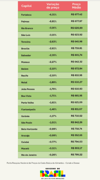 NACIONAL - Em âmbito nacional, as reduções mais expressivas em setembro ocorreram em Fortaleza (-6,31%), Palmas (-5,91%), Rio Branco (-3,16%), São Luís (-3,15%) e Teresina (-2,63%). Os menores valores médios foram registrados em Aracaju (R$ 552,65), Maceió (R$ 593,17), Salvador (R$ 601,74), Natal (R$ 610,27) e João Pessoa (R$ 610,93). O maior custo ficou em São Paulo (R$ 842,26).