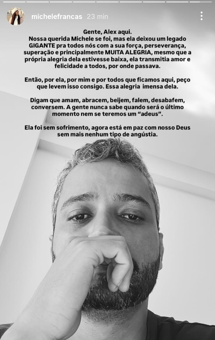 Na manhã desta quarta-feira (8), seu companheiro, Alex Pacifíco, prestou homenagem nas redes sociais, destacando o legado de alegria, amor e superação que Michele deixou, e pediu que amigos e familiares celebrem a vida e a força da influenciadora.