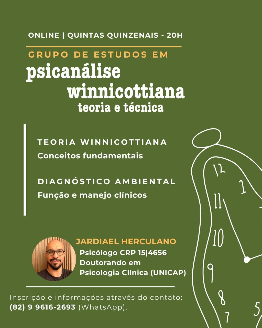 O psicólogo Jardiael Herculano (CRP 15/4656), doutorando em Psicologia Clínica pela UNICAP, conduz o Grupo de Estudos em Psicanálise Winnicottiana: Teoria e Técnica, com encontros online e quinzenais, às 20h.