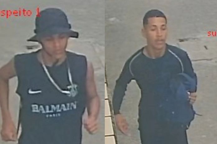 As imagens divulgadas mostram dois suspeitos em fuga: um deles é moreno, usava chapéu, camisa regata preta e short branco; o outro vestia uma camisa de banho preta de manga longa e short preto.