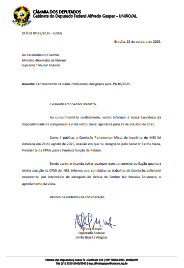 No ofício, divulgado na tarde desta quinta-feira (23), Gaspar explica que decidiu adiar o encontro para evitar qualquer questionamento sobre sua atuação como relator da CPMI do INSS. Ele afirmou que só solicitará a visita após o fim dos trabalhos da comissão.