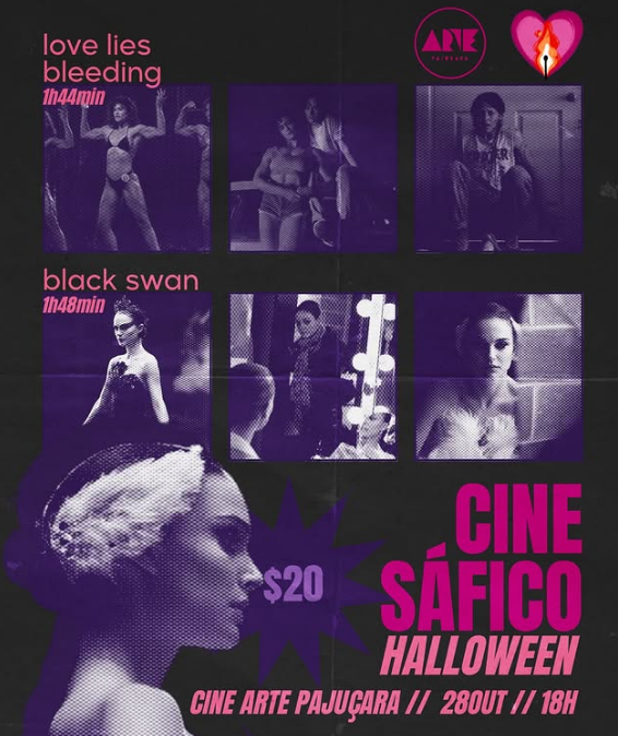 Para terminar a programação dessa semana, se você gosta de cinema e halloween, prepara a pipoca e cola no Centro Cultural Arte Pajuçara para uma sessão dupla com os filmes Love Lies Bleeding e Black Swan.