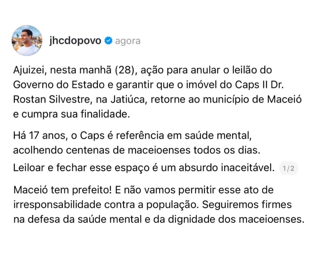 “Há 17 anos o Caps é referência em saúde mental, acolhendo centenas de maceioenses todos os dias. Leiloar e fechar esse espaço é um absurdo inaceitável”, escreveu.
