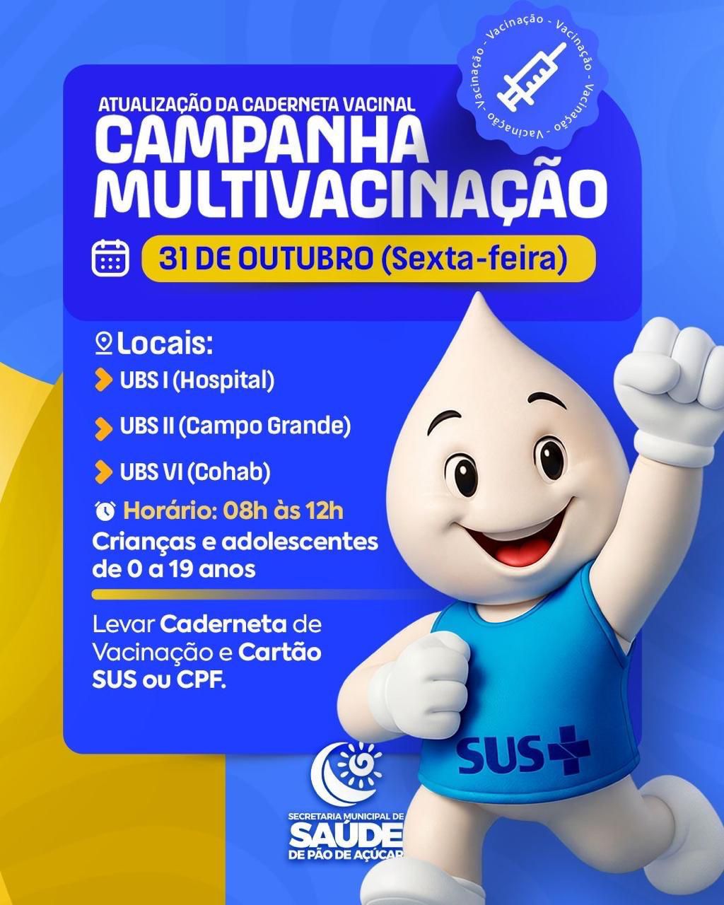 Nesta sexta-feira, 31 de outubro de 2025, Pão de Açúcar realiza o Dia D da Imunização, uma grande mobilização voltada à saúde infantil. A ação acontecerá das 08h às 12h, nos Postos de Saúde do Hospital, Campo Grande e Cohab, com o objetivo de garantir que todas as crianças do município estejam com as cadernetas de vacinação atualizadas.