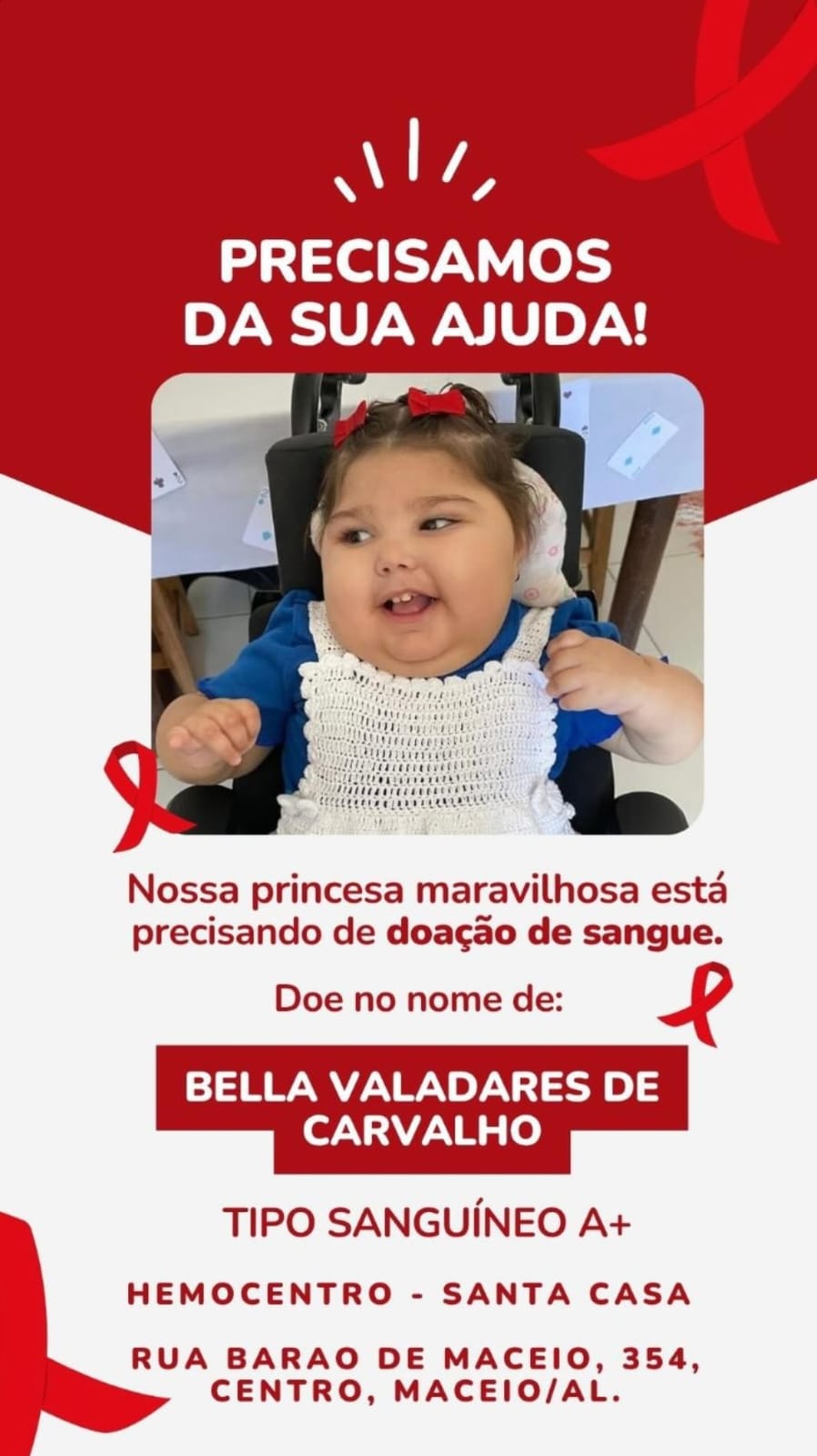 Parentes da pequena Bella Valadares de Carvalho, de apenas 2 anos, divulgaram um pedido de ajuda nesta quinta-feira (30). A menina, que é uma criança atípica, está enfrentando um quadro de anemia e precisa com urgência de doações de sangue do tipo A+.