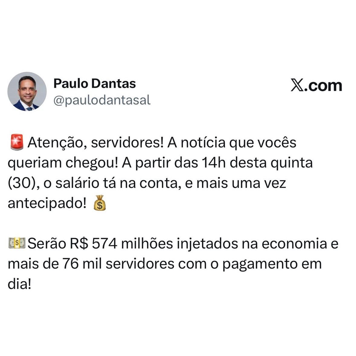 O governador de Alagoas, Paulo Dantas (MDB), anunciou nas redes sociais, nesta quinta-feira (30), a antecipação do pagamento dos servidores estaduais, que terão os salários disponíveis a partir das 14h.