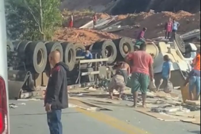 Imagens registradas no local mostram o veículo completamente virado e diversas pessoas saqueando a carga espalhada pela pista.