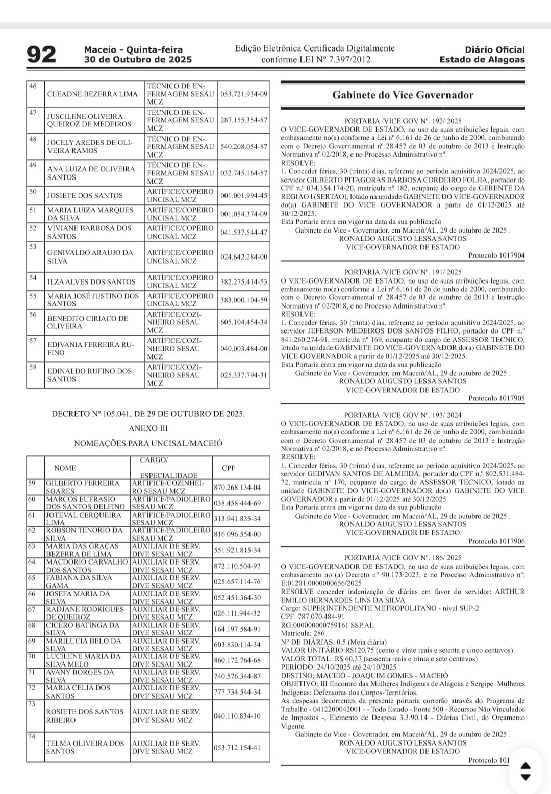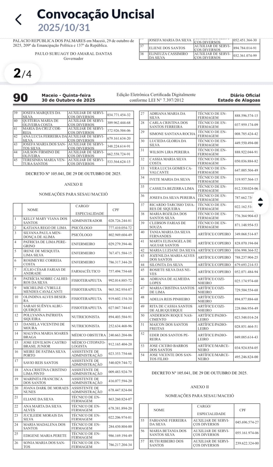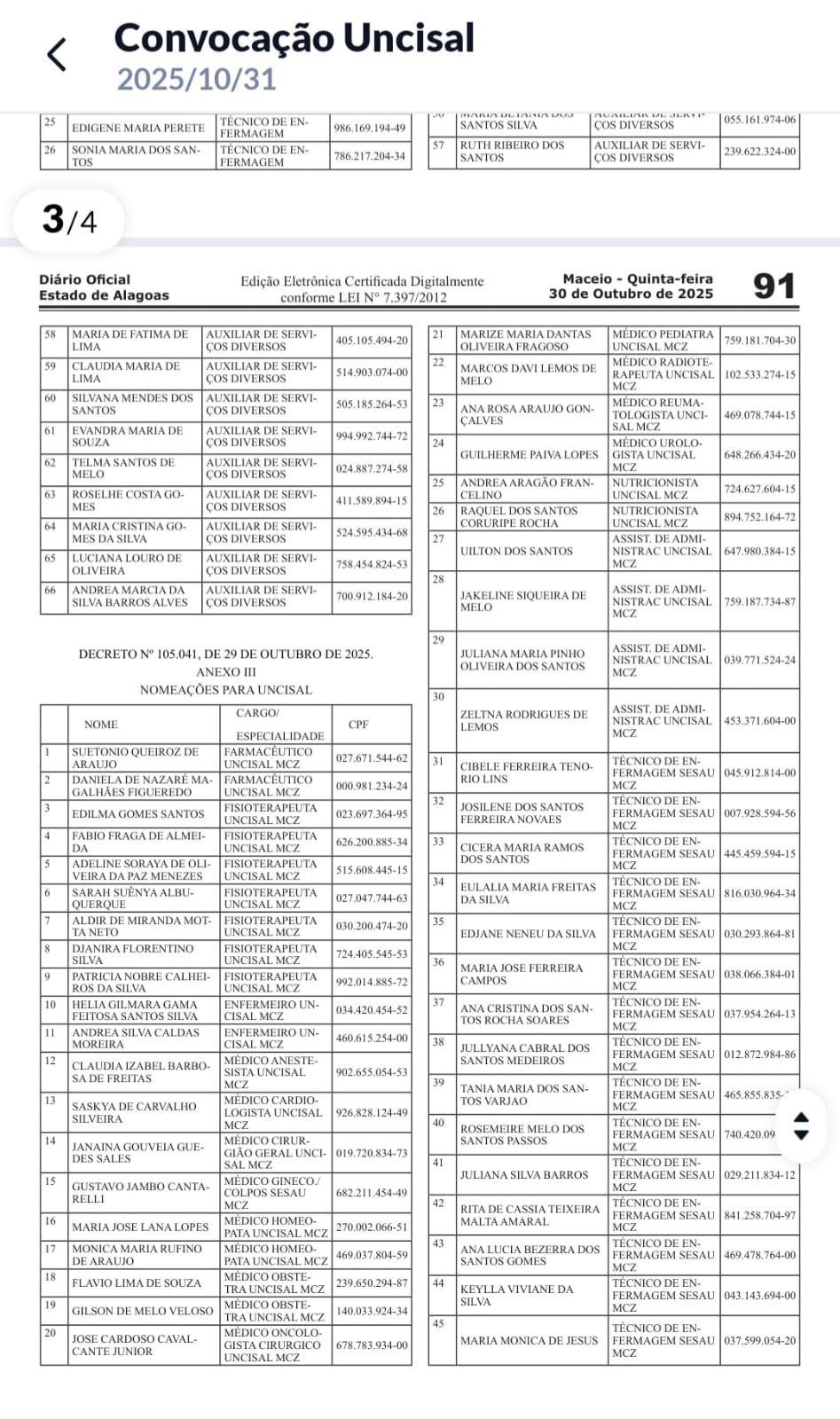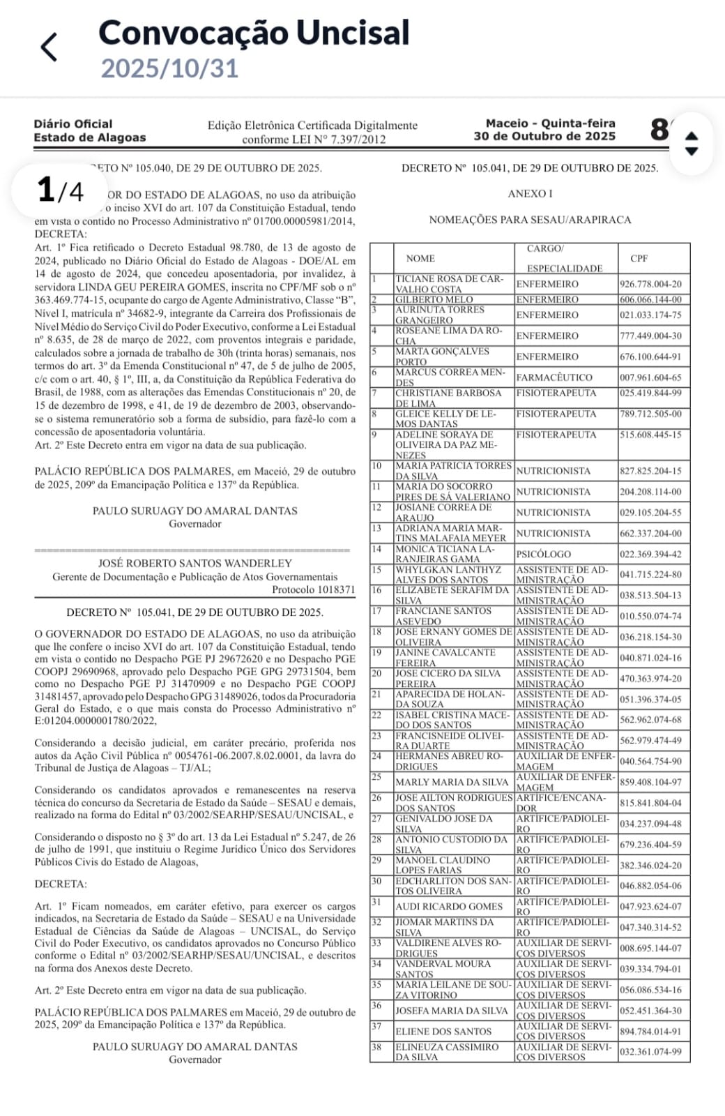 A publicação encerra um processo administrativo iniciado em 2022 e cumpre determinações legais previstas no Regime Jurídico Único dos Servidores Públicos Civis do Estado. Os nomeados passam a integrar, em caráter efetivo, o quadro da Sesau e da Uncisal, conforme os cargos descritos nos anexos do decreto.
