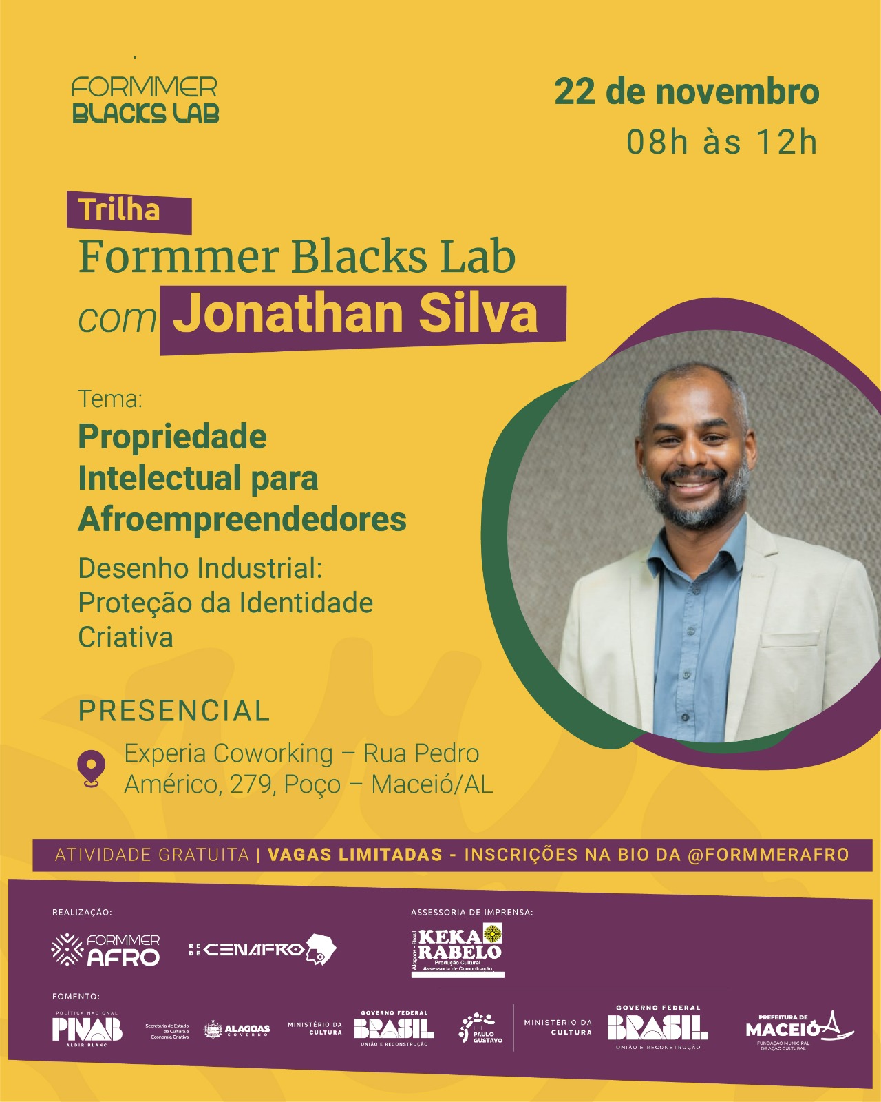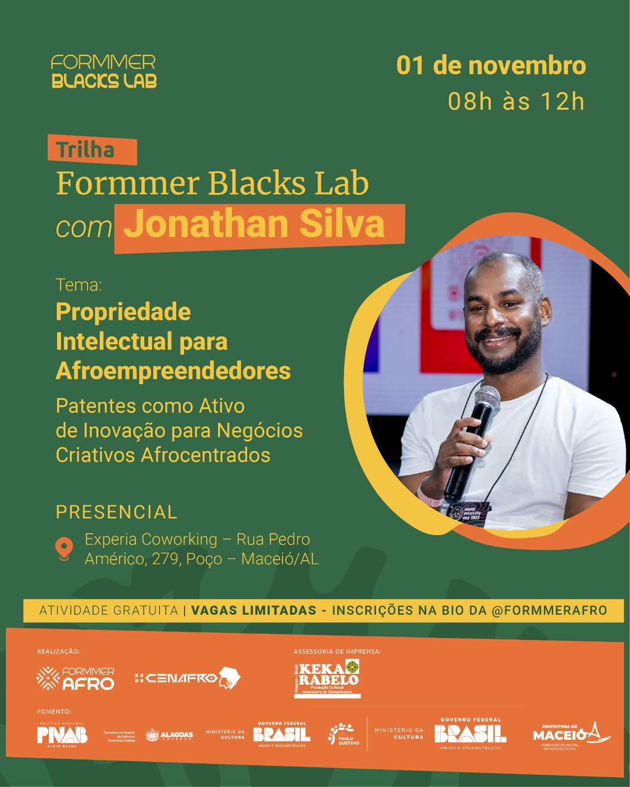 As formações presenciais acontecem em novembro, no Experia Coworking, em Maceió/AL, conduzidas por Jonathan Silva — administrador, doutorando em Ciência da Propriedade Intelectual (PPGPI/UFS), mestre em Propriedade Intelectual e Transferência de Tecnologia para Inovação (PROFNIT/UFAL) e especialista em Gestão Estratégica de Negócios e Mercado (USP). Atualmente, Jonathan também é mestrando em Administração e Controladoria com ênfase em Gestão Cultural (PPAC/UFC).