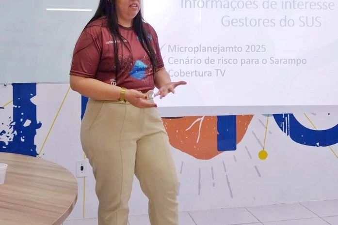 A assessora técnica Kathleen Moura atualizou os diretores sobre o microplanejamento do Programa Nacional de Imunização (PNI) de 2026, cenário de risco para o sarampo e a cobertura da tríplice viral.