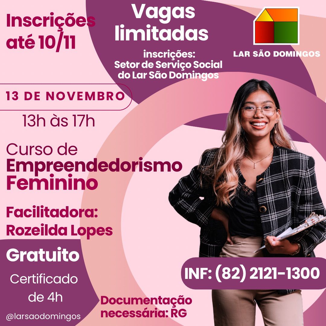 Será realizado no dia 13 de novembro, das 13h às 17h, no auditório do Lar São Domingos o curso de Empreendedorismo Feminino.
