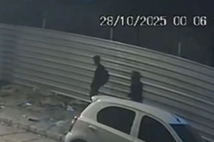 As imagens mostram três suspeitos. Dois deles, identificados como “Autor 1” e “Autora 2”, chegam ao local a pé e são vistos observando a área onde o crime ocorreu, próximos a um tapume.