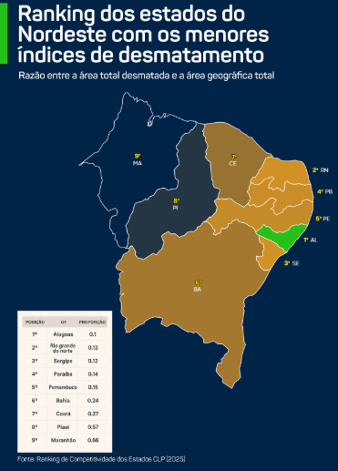 Enquanto o mundo discute o futuro do planeta na 30ª Conferência do Clima da ONU (COP30), em Belém do Pará, Alagoas surge como um exemplo positivo na pauta ambiental. De acordo com o Centro de Liderança Pública (CLP), o estado registra o menor índice de desmatamento do Nordeste.