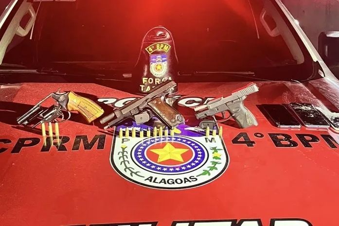 Dentro do automóvel, os policiais apreenderam três armas — duas pistolas calibre 9 mm e um revólver calibre 38 com numeração raspada — além de diversas munições e quatro celulares.