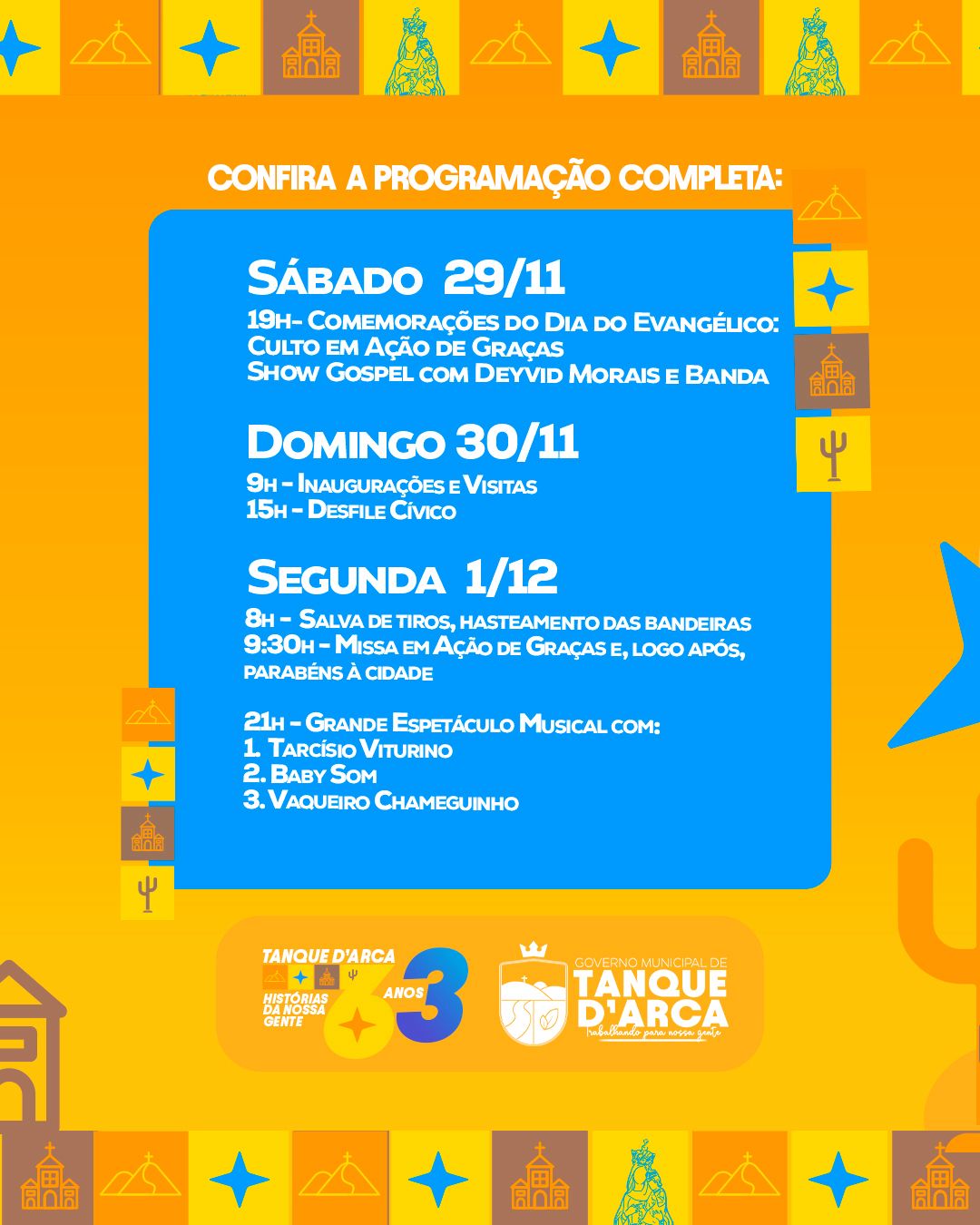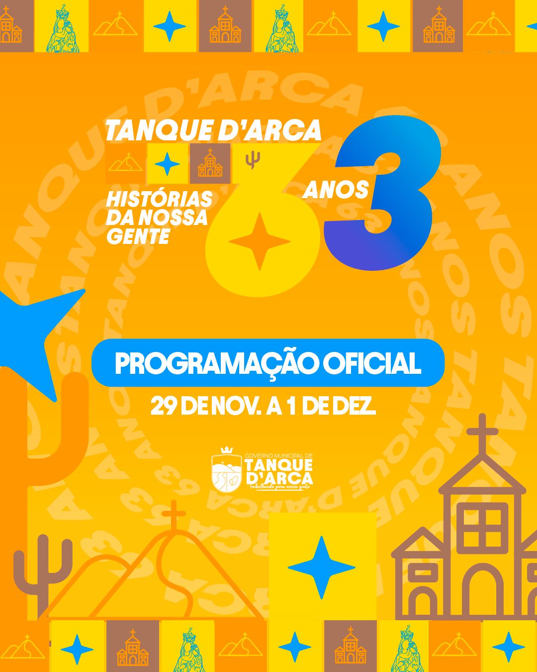 A Prefeitura de Tanque d’Arca, por meio do prefeito Didi Lopes, realizará entre os dias 29 de novembro e 1 de dezembro uma ampla programação comemorativa pelos 63 anos de emancipação política do município. Serão três dias de eventos voltados à fé, cultura, civismo e celebração, reforçando a importância histórica da data para a população tanquedarquense.