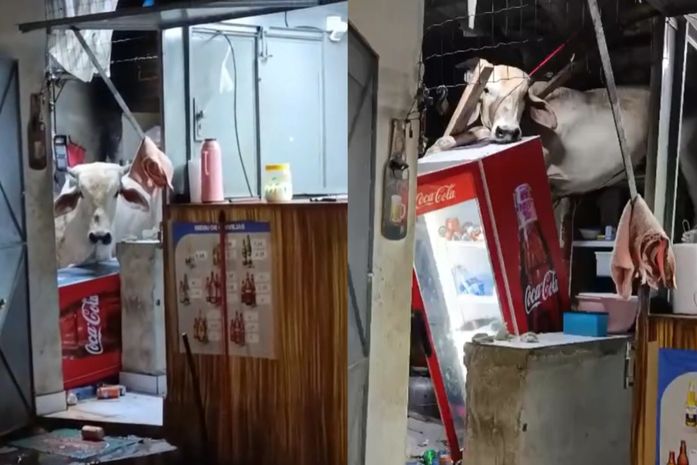 Segundo o restaurante, o incidente causou danos estruturais e prejuízos materiais significativos. Nas imagens é possível ver a vaca derrubando uma geladeira cheia de bebidas, que ficaram jogadas no chão. A presença do animal também danificou as telhas, um armário e outros objetos do restaurante. Veja a imagem: