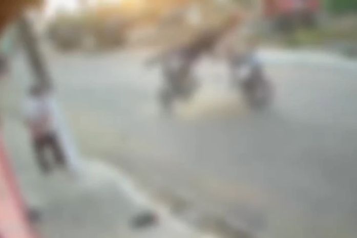 As imagens mostram o momento em que os motociclistas passam em direções opostas e se chocam no meio da rua e as três vítimas caem com o impacto.