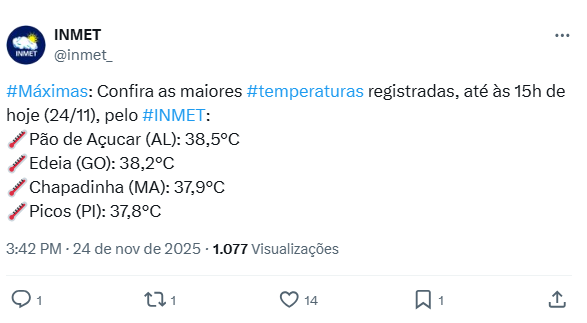 O município — às margens do Rio São Francisco — já havia figurado no topo das medições recentemente. No dia 7 de novembro, Pão de Açúcar atingiu 39,1°C, a maior máxima do país. Na mesma data, Piranhas, também no sertão alagoano, registrou 38,5°C, ocupando a terceira colocação entre as temperaturas mais altas.