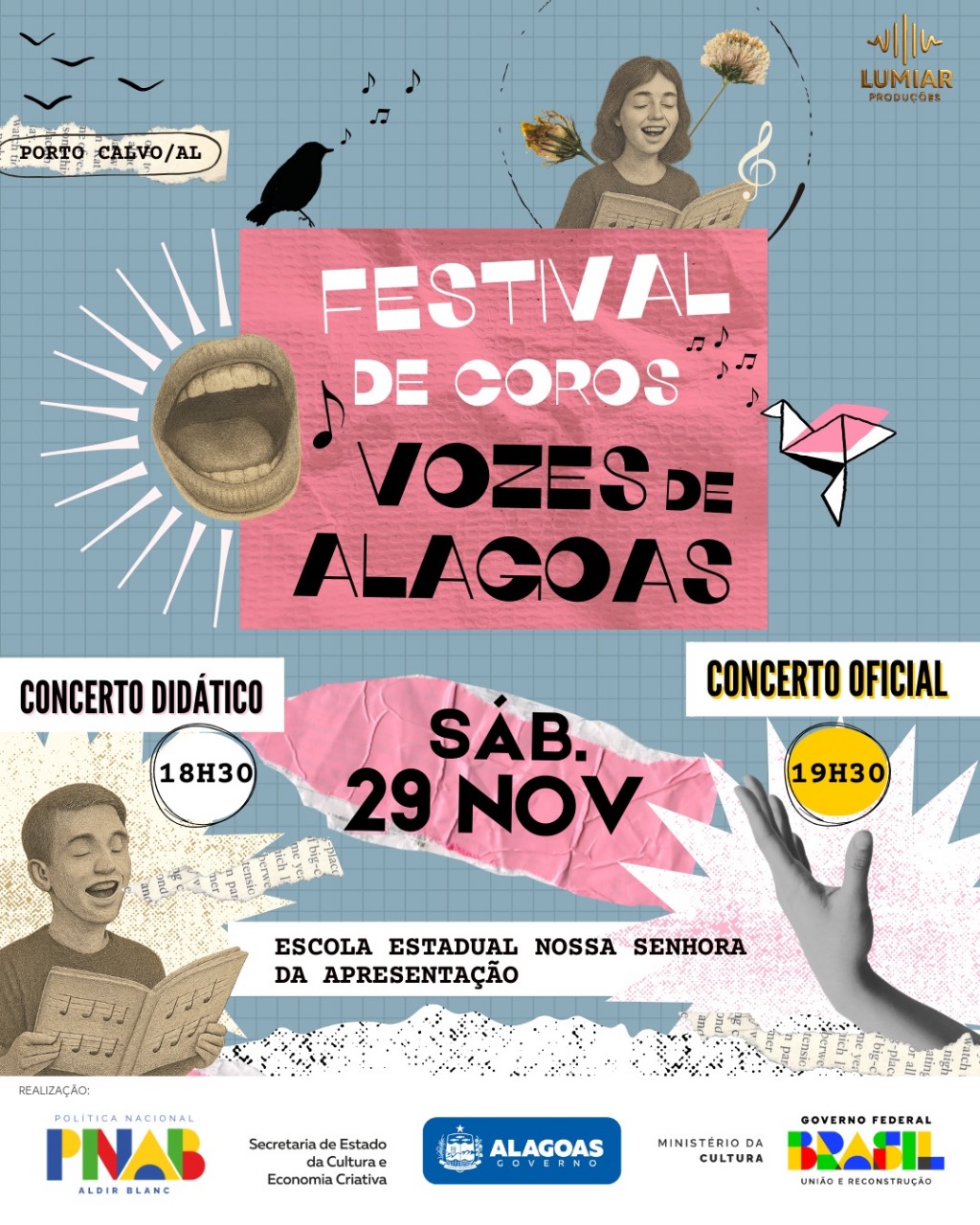Com a promessa de encantar gerações, amantes e não amantes de coral, nos próximos dias 29 e 30 de novembro, acontece em Porto Calvo e Maceió, o primeiro Festival de Coros Vozes de Alagoas. As apresentações irão ocorrer no dia 29 em Porto Calvo no Auditório da Escola Estadual Nossa Senhora da Apresentação e no dia 30 em Maceió, na Igreja Nossa Senhora das Graças, Pitanguinha.