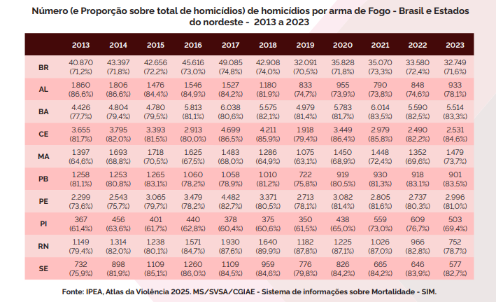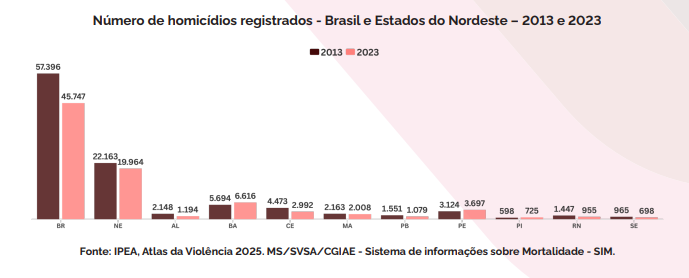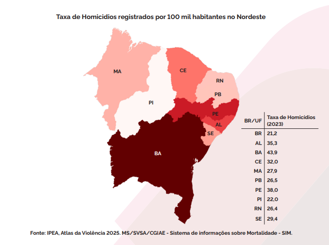 Em 2023, o Brasil registrou 45.747 homicídios — o menor número da série histórica recente — com uma taxa de 21,2 casos por 100 mil habitantes, segundo o Ipea (instituto de Pesquisa Econômica Aplicada) e o Fórum Brasileiro de Segurança Pública (FBSP). No Nordeste, a taxa estimada chegou a 32,1 homicídios por 100 mil habitantes, conforme o boletim da Sudene.