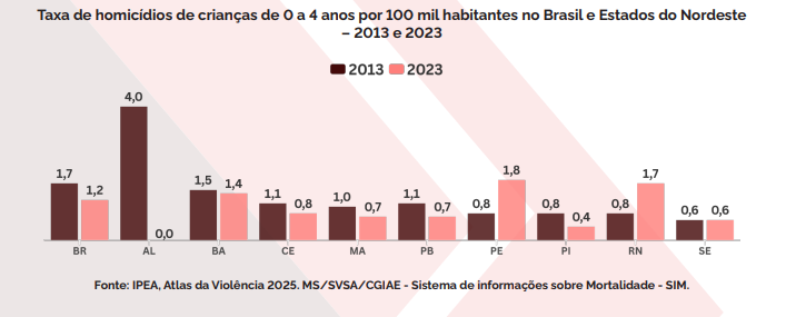Apesar de o boletim enfocar especialmente homicídios gerais, há menção à violência letal contra crianças de 0 a 4 anos, como visto acima, e à mortalidade por homicídios de mulheres no Nordeste. No contexto regional, a queda de homicídios de mulheres foi menos acentuada no Nordeste do que no restante do país — e estados como Alagoas participaram desse paradoxo.