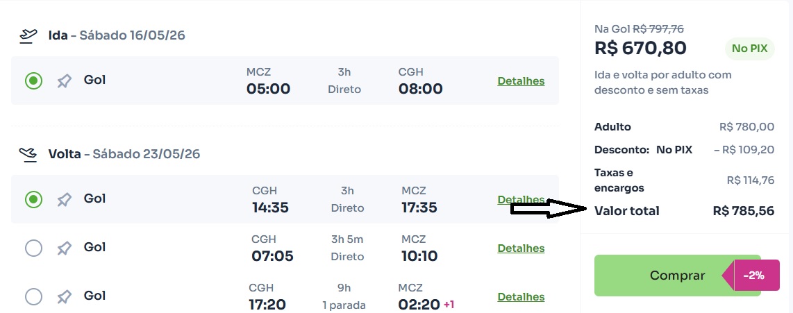Também pela Gol tem voo direto de Maceió para São Paulo (Congonhas) por R$ 785 (Veja detalhes na imagem abaixo). Na semana passada as passagens estavam sendo vendidas por R$ 905. Da capital alagoana para o Aeroporto de Guarulhos a Gol tem passagens em voo direto por R$ 885.