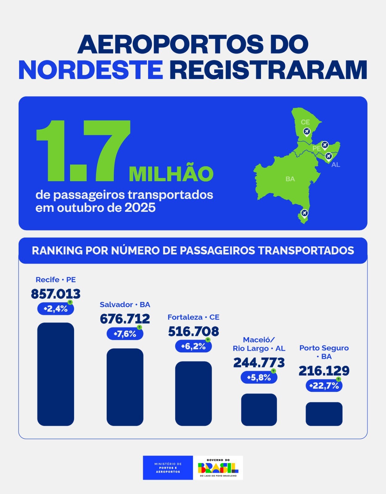 O resultado de outubro acompanha o avanço acumulado ao longo de 2025. Entre janeiro e outubro, mais de 19,2 milhões de pessoas embarcaram na região, somando operações domésticas e internacionais. Recife, Maceió, Porto Seguro, São Luís, João Pessoa e Aracaju impulsionam esse desempenho, que representa a maior movimentação da década para o período.