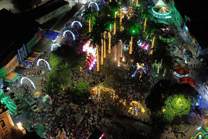 Em contagem regressiva, a praça e as principais estruturas ganharam iluminação especial, arrancando aplausos e emoção dos presentes.