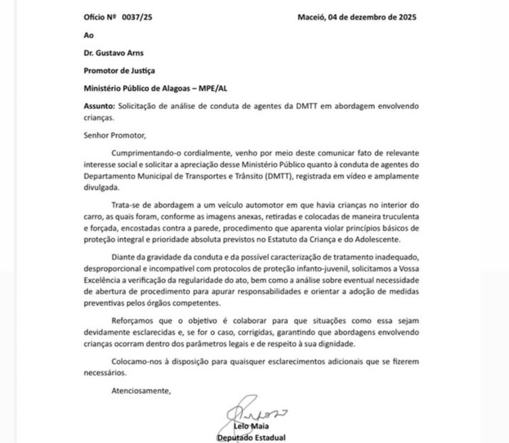 O deputado estadual Lelo Maia denunciou, na manhã desta quinta-feira (4), uma abordagem considerada abusiva por agentes do DMTT. Em um vídeo enviado ao parlamentar, é possível ver um agente interrogando uma criança na calçada, em vez de dialogar com o motorista de um veículo parado por suspeita de realizar transporte escolar irregular.