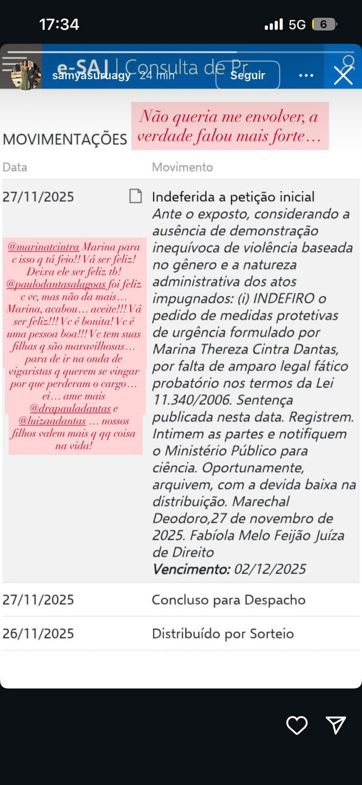 No post, Samya coloca um print da decisão judicial e diz que Marina "fosse ser feliz" e deixasse de ir na onda de vigaristas.