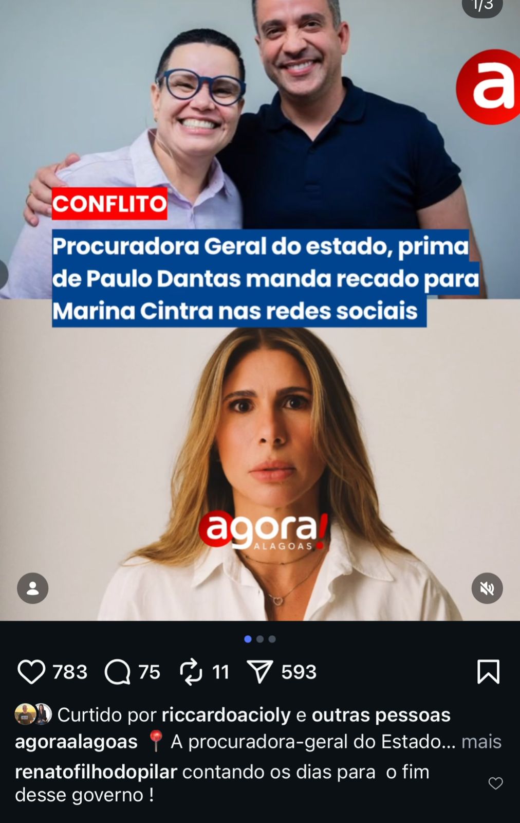 Repercutiu no meio político um comentário feito pelo ex-prefeito do Pilar, Renato Filho (MDB), nesse sábado (6). "Contando os dias para o fim desse governo", escreveu Renatinho, ao comentar uma postagem do site Agora Alagoas, intitulada "Procuradora Geral do Estado, prima de Paulo Dantas manda recado para Marina Cintra nas redes sociais".