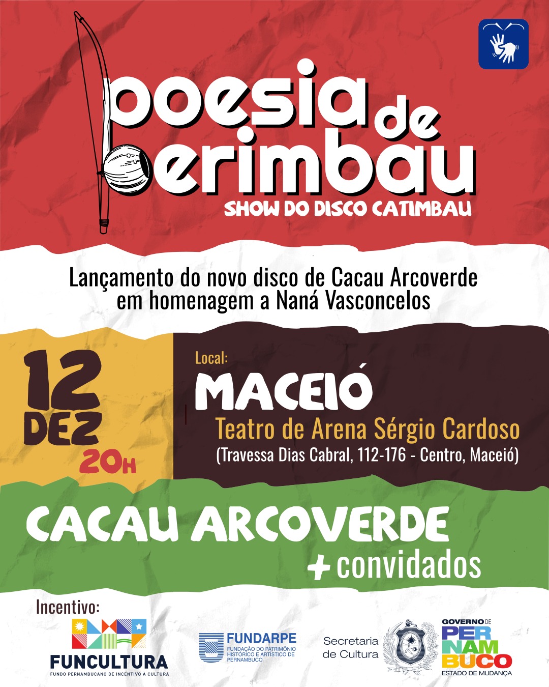 Poesia de Berimbau, música em homenagem a Naná Vasconcelos, dá nome ao show de lançamento do disco Catimbau, primeiro trabalho solo do artista pernambucano Cacau Arcoverde. Com 32 anos de trajetória como percussionista e produtor musical, o artista, que também é luthier, celebra o momento com apresentações em cidades representativas na sua vida, onde irá apresentar o repertório do disco com banda e convidados. Maceió está no roteiro artístico e afetivo do artista, que convidou a Mestra Zeza do Coco e Telma César para uma participação especial no show, que será no Teatro de Arena Sérgio Cardoso, dia 12 de dezembro. O show, com classificação etária livre, tem acessibilidade em libras e entrada gratuita mediante doação de 1kg de alimento não perecível e retirada de ingressos no Sympla.