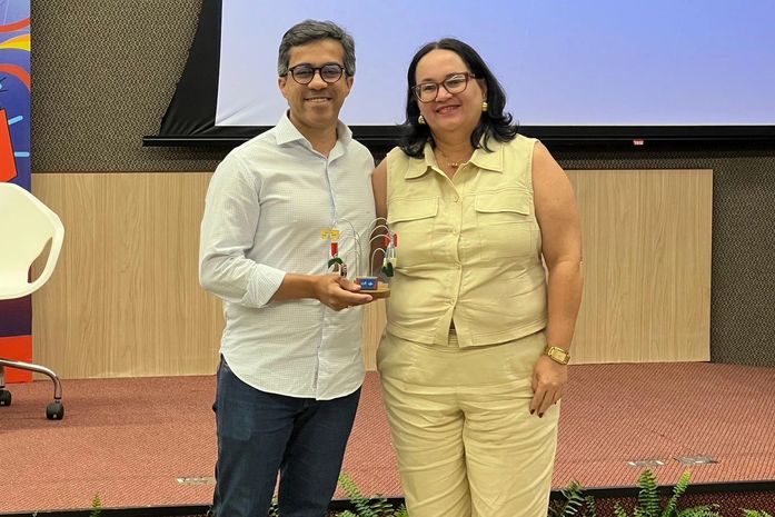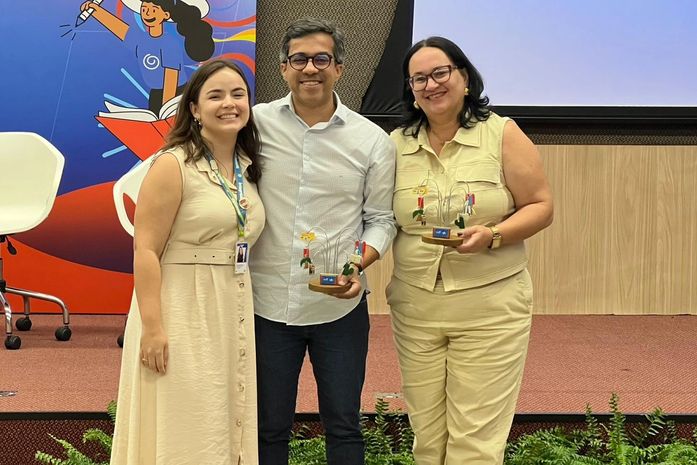A honraria pelo secretário municipal de Educação, Álvaro Leiva, e pela coordenadora de Ensino, Rita Paiva, durante a cerimônia do evento “Educação que Transforma” um momento para celebrar os avanços ao longo do ano, através do projeto “Educação Empreendedora”, com os parceiros alagoanos.