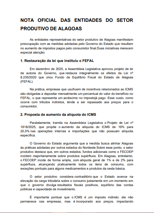 Na avaliação das entidades, chama atenção o avanço dessas medidas em um contexto no qual o Estado divulga resultados fiscais positivos, equilíbrio das contas públicas e capacidade de investimento. O setor produtivo defende o equilíbrio fiscal e o desenvolvimento de Alagoas, mas pondera que esses objetivos devem ser alcançados com maior eficiência do gasto público, combate à evasão fiscal, estímulo à atividade produtiva e ampliação da base econômica, com previsibilidade e segurança jurídica.