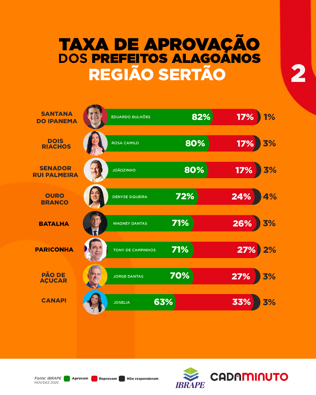 No segundo grupo da pesquisa, Santana do Ipanema apresenta 82% de aprovação para a gestão de Eduardo Bulhões. Logo depois, aparecem Dois Riachos e Senador Rui Palmeira, ambos com 80% de aprovação, sob as administrações de Rosa Camilo e Joãozinho. Em Ouro Branco, a prefeita Denyse Siqueira tem 72% de aprovação, enquanto Batalha e Pariconha registram 71% de avaliação positiva para Wagney Dantas e Tony de Campinhos. Pão de Açúcar aparece com 70% de aprovação da gestão de Jorge Dantas, e Canapi encerra esse bloco com 63% de aprovação da prefeita Joselia.