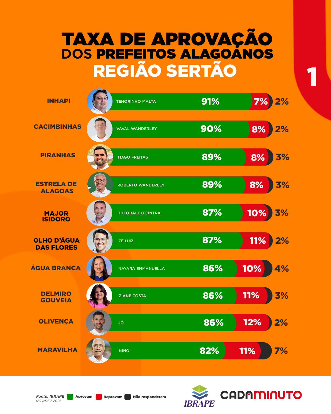 O maior índice de aprovação da região aparece em Inhapi, onde o prefeito Tenorinho Malta alcança 91% de aprovação, com apenas 7% de reprovação. Em seguida, surgem Cacimbinhas, com Vaval Wanderley aprovado por 90% dos entrevistados, e Piranhas e Estrela de Alagoas, cujos prefeitos Tiago Freitas e Roberto Wanderley, respectivamente, registram 89% de aprovação cada.