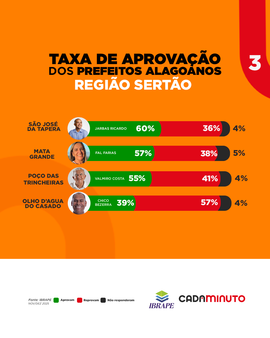 No terceiro recorte do levantamento, os índices de aprovação são mais modestos. Em São José da Tapera, o prefeito Jarbas Ricardo tem 60% de aprovação, seguido por Mata Grande, onde Fal Farias registra 57%. Poço das Trincheiras aparece com 55% de aprovação da gestão de Valmiro Costa. O cenário mais desfavorável da região é observado em Olho d’Água do Casado, onde o prefeito Chico Bezerra tem 39% de aprovação, contra 57% de reprovação, sendo o único gestor sertanejo com índice negativo superior ao positivo.