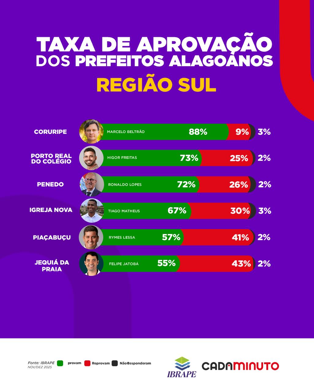 O instituto Ibrape, em parceria com o CadaMinuto, iniciou nesta segunda-feira (15) a divulgação de uma série de pesquisas sobre a avaliação das gestões dos 82 municípios mais populosos de Alagoas. O levantamento apresentado corresponde às cidades da Região Sul do Estado.