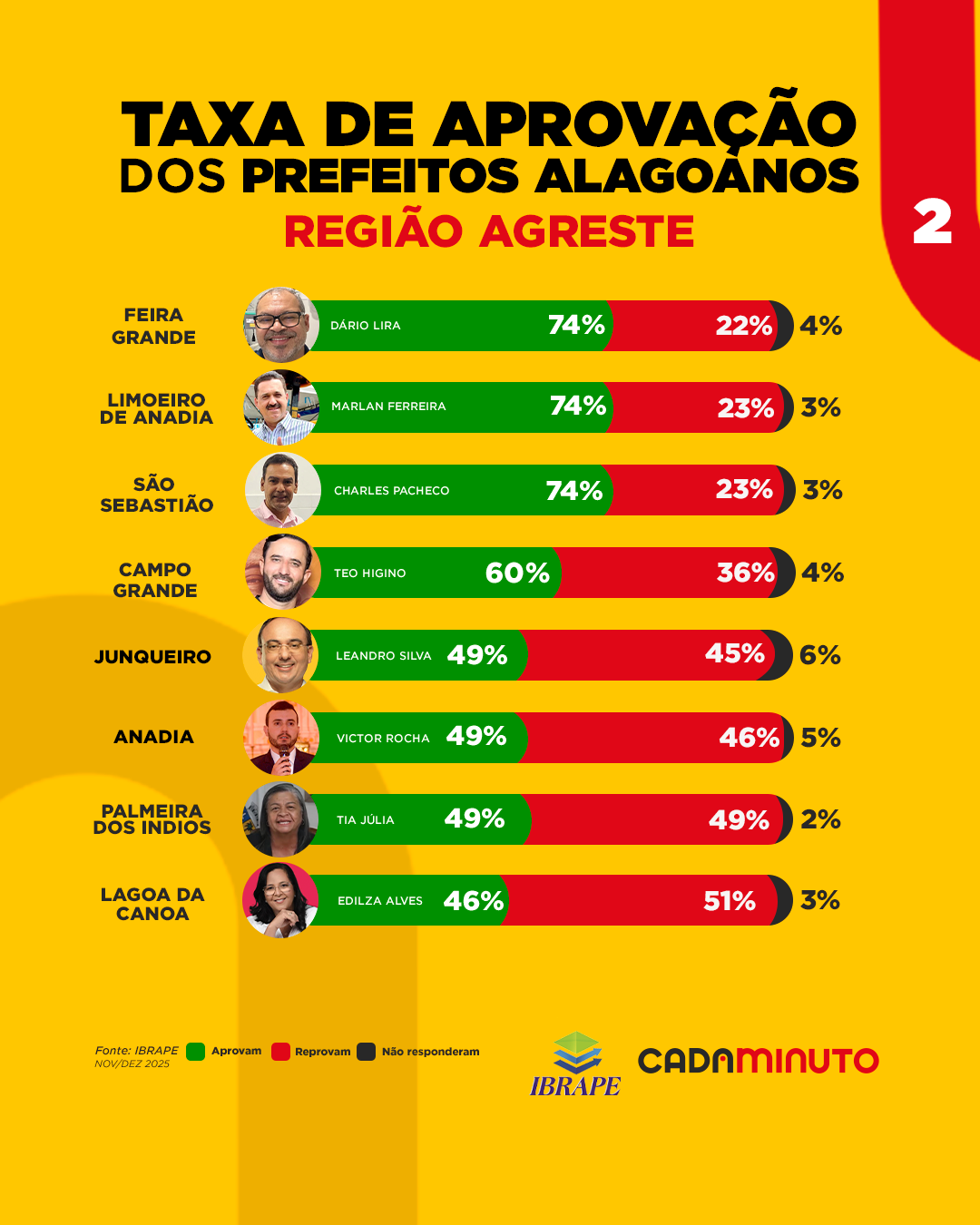 Na sequência, em Feira Grande, o prefeito Dário Lira apresenta 74% de aprovação, 22% de reprovação e 4% de indecisos.
