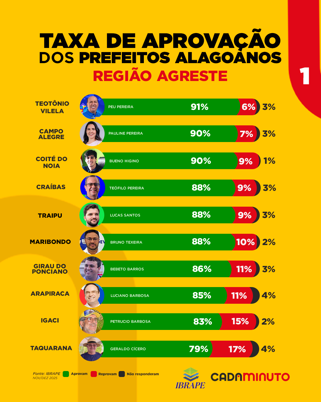 Em Teotônio Vilela, o prefeito Peu Pereira registra 91% de aprovação, 6% de reprovação e 3% não responderam.
