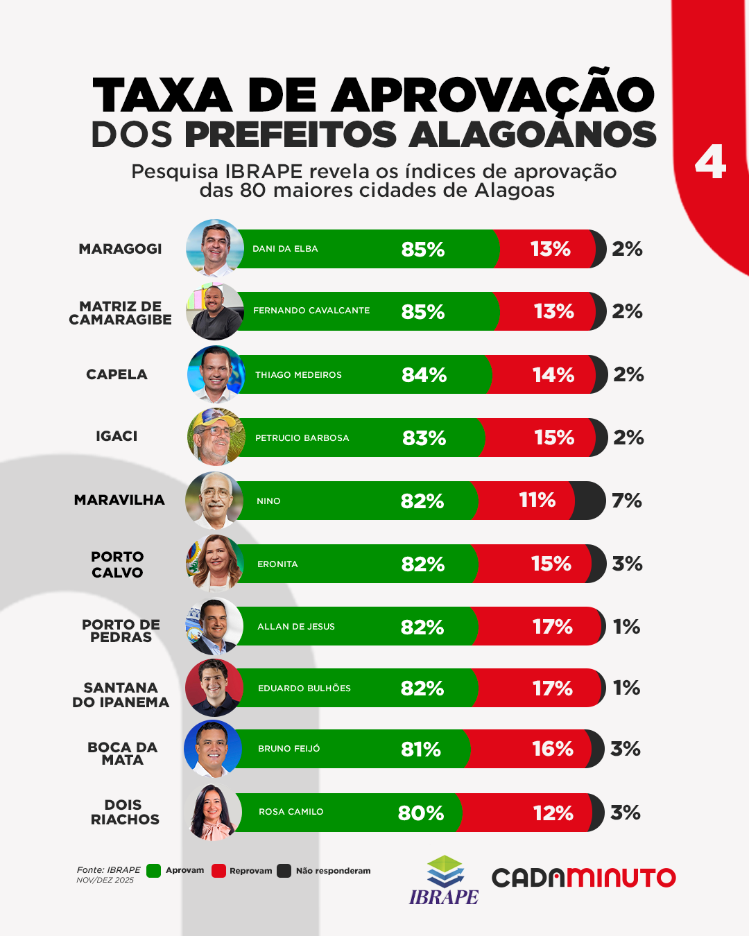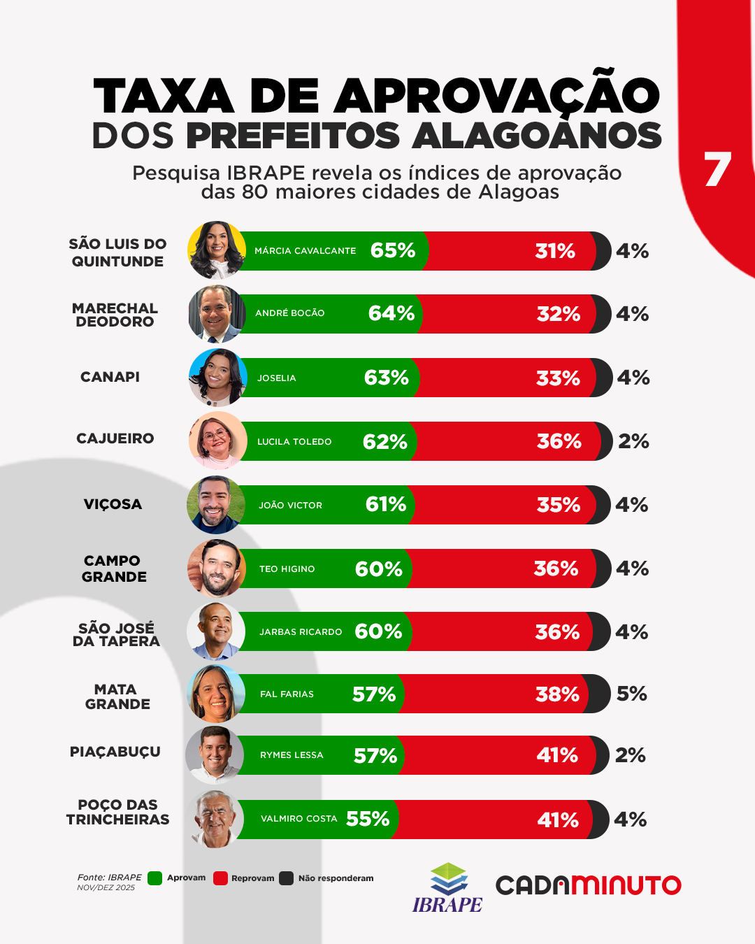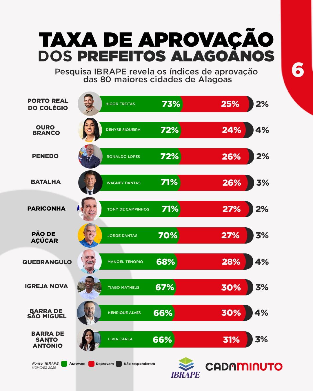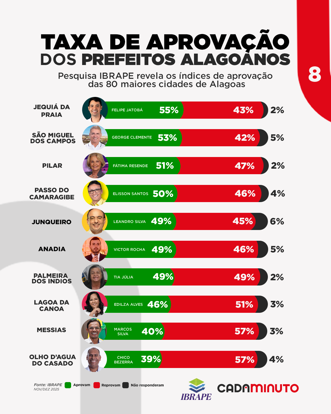 Uma pesquisa realizada pelo Instituto Ibrape, em parceria com o CadaMinuto, traz um panorama sobre a avaliação das gestões municipais nas 80 maiores cidades de Alagoas. O levantamento ouviu eleitores para medir a percepção da população sobre o desempenho dos prefeitos, considerando critérios como aprovação, reprovação e avaliação regular das administrações locais.