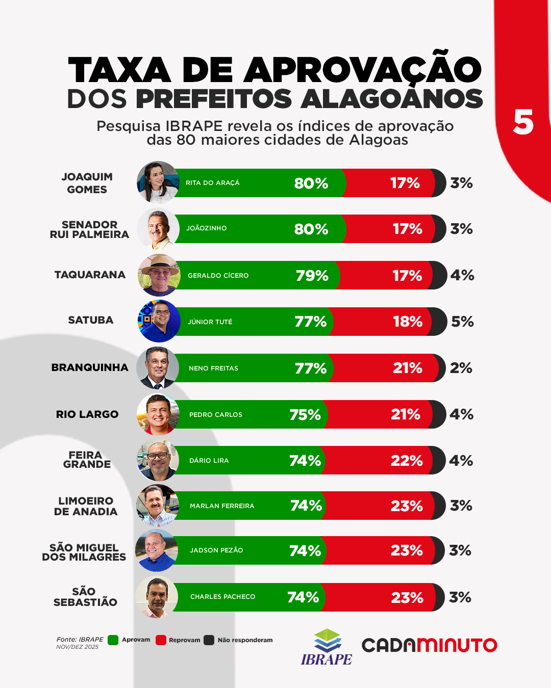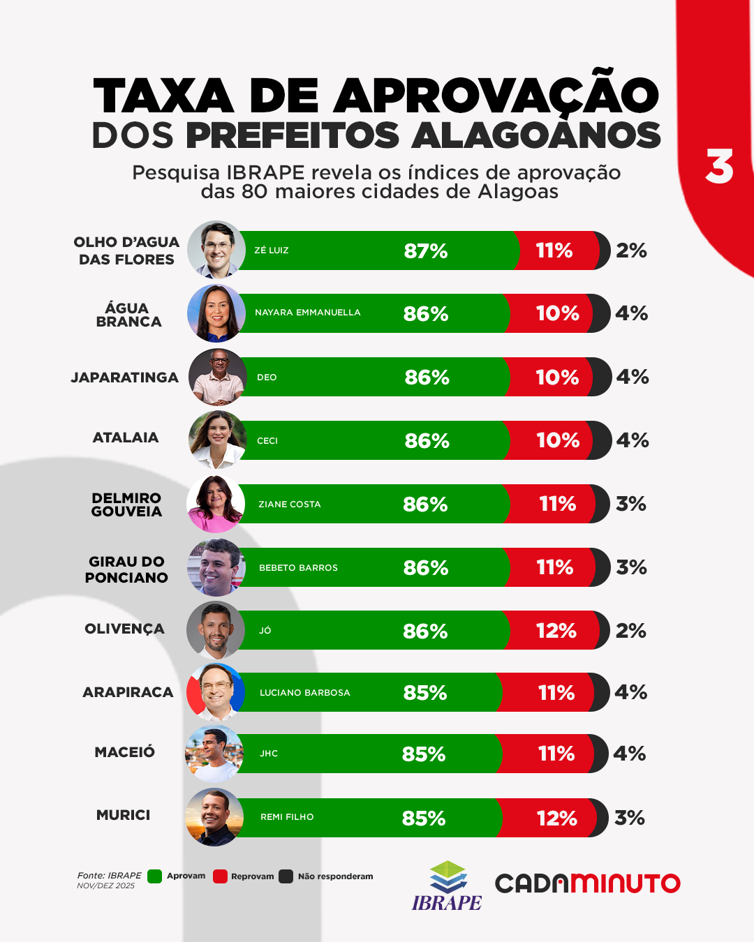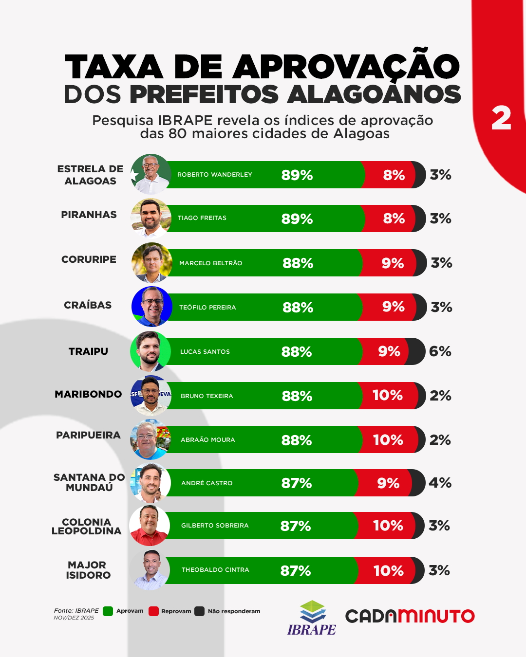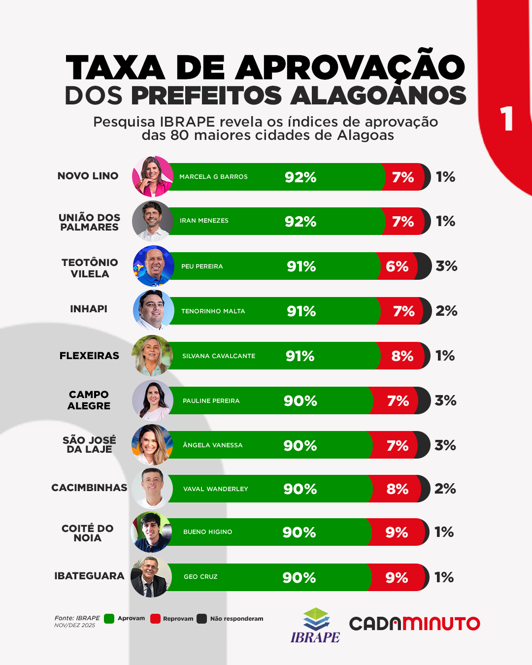 Os dados revelam diferenças significativas entre os municípios, refletindo realidades distintas na condução das políticas públicas e na relação entre gestores e população. A pesquisa serve como termômetro do cenário político municipal e ajuda a compreender como os alagoanos avaliam as gestões em curso em suas cidades.