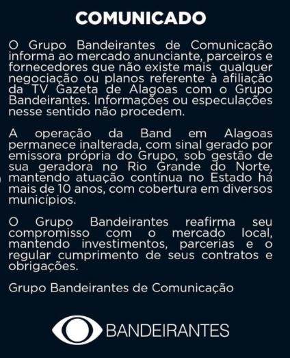 O Grupo Bandeirantes de Comunicação negou qualquer tratativa envolvendo uma possível afiliação da TV Gazeta de Alagoas à rede. Em comunicado oficial, a empresa afirmou que não há negociações em andamento e classificou como infundadas as informações que circulam sobre o assunto.
