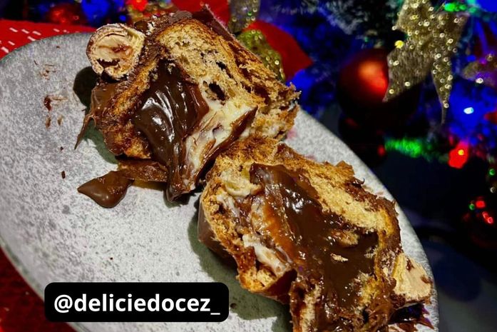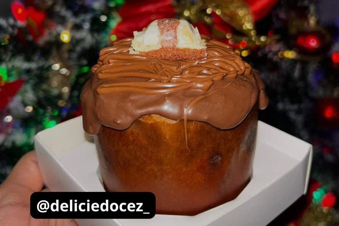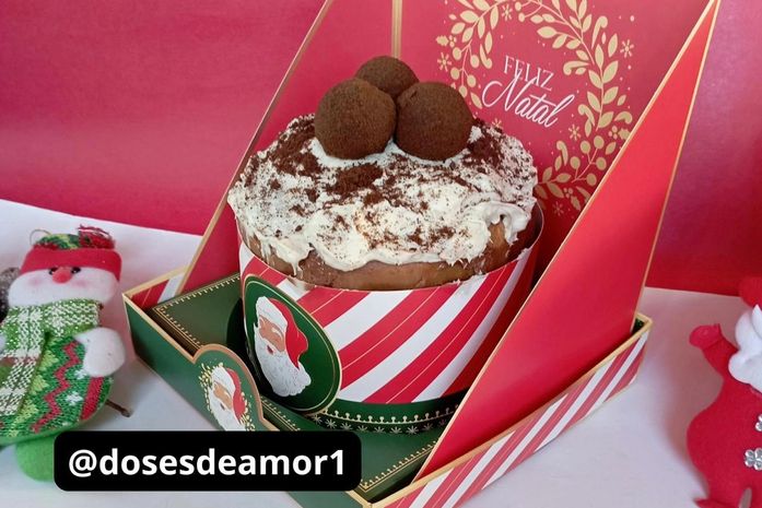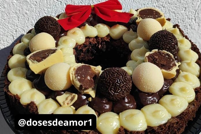 A confeiteira trabalha com chocotones recheados, brigadeiros e guirlanda de brownie. Começa a organizar o cardápio em novembro para que as pessoas consigam se programar e ela consiga atender à demanda da época.