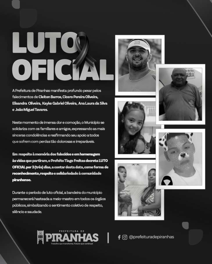O município de Piranhas decretou nesta segunda-feira (5), luto oficial de três dias após o grave acidente ocorrido na rodovia AL-220, entre o distrito de Piau e Olho d’Água do Casado. A colisão entre uma Chevrolet Montana e um Chevrolet Onix resultou na morte de seis pessoas.