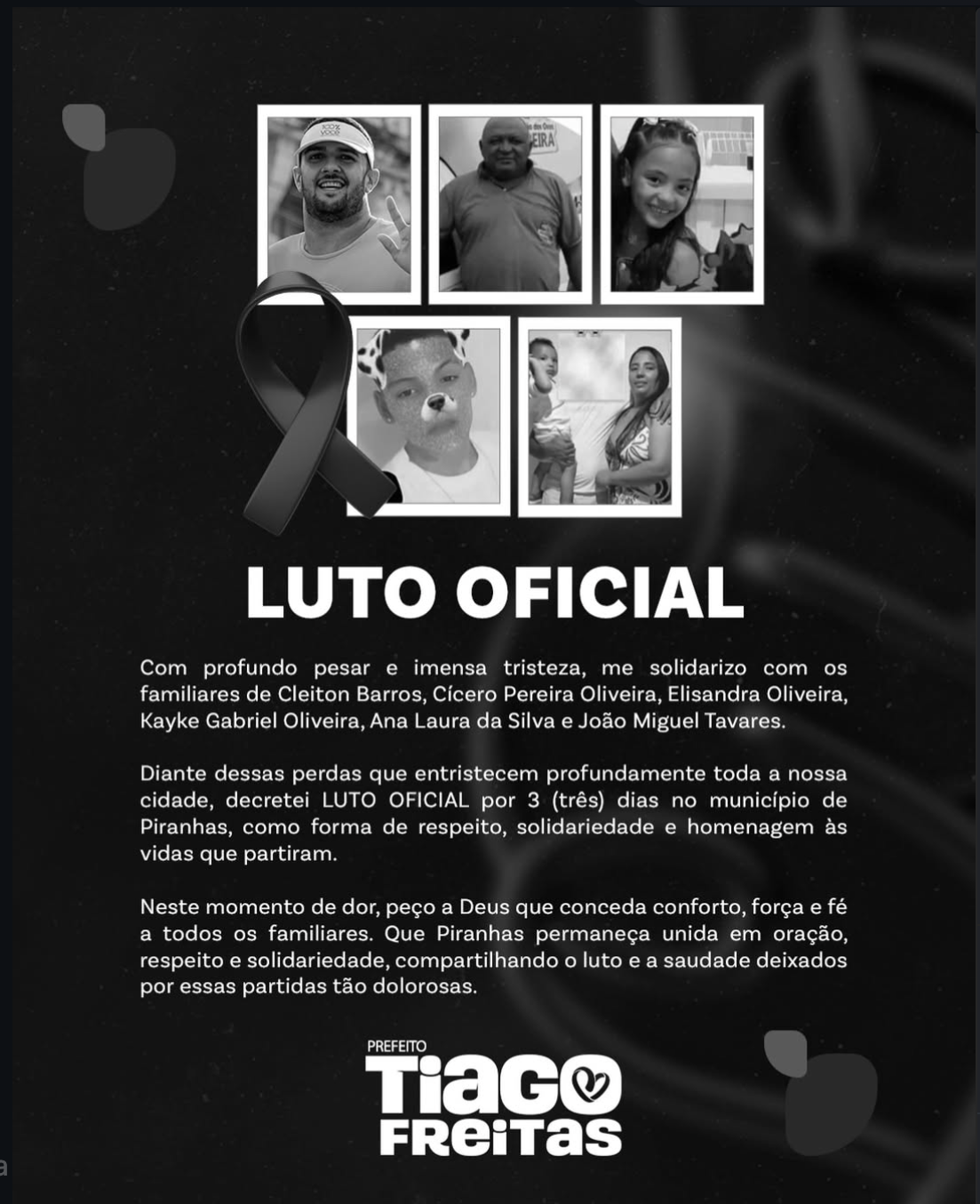 O município de Piranhas decretou nesta segunda-feira (5) luto oficial de três dias após o grave acidente registrado na rodovia AL-220.