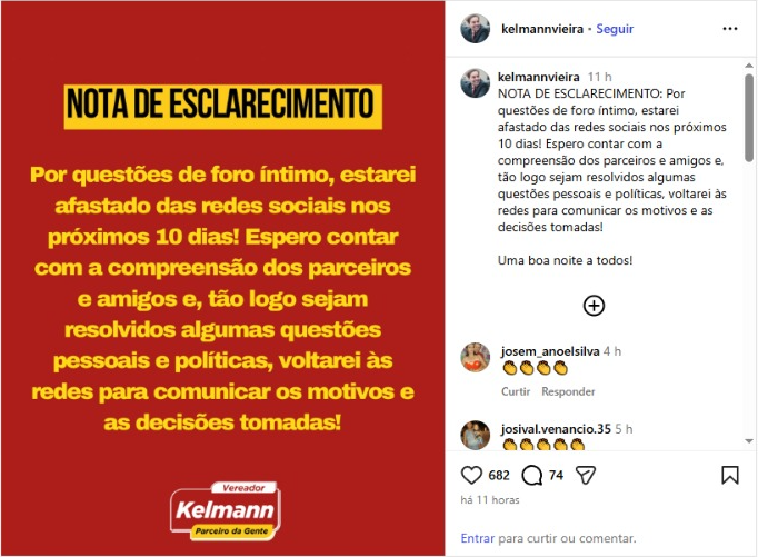 O vereador de Maceió, Kelmann Vieira (MDB), anunciou, na noite dessa quinta-feira (8), que ficará afastado das redes sociais pelos próximos dez dias. A informação foi divulgada por meio de uma nota publicada em seus perfis oficiais.
